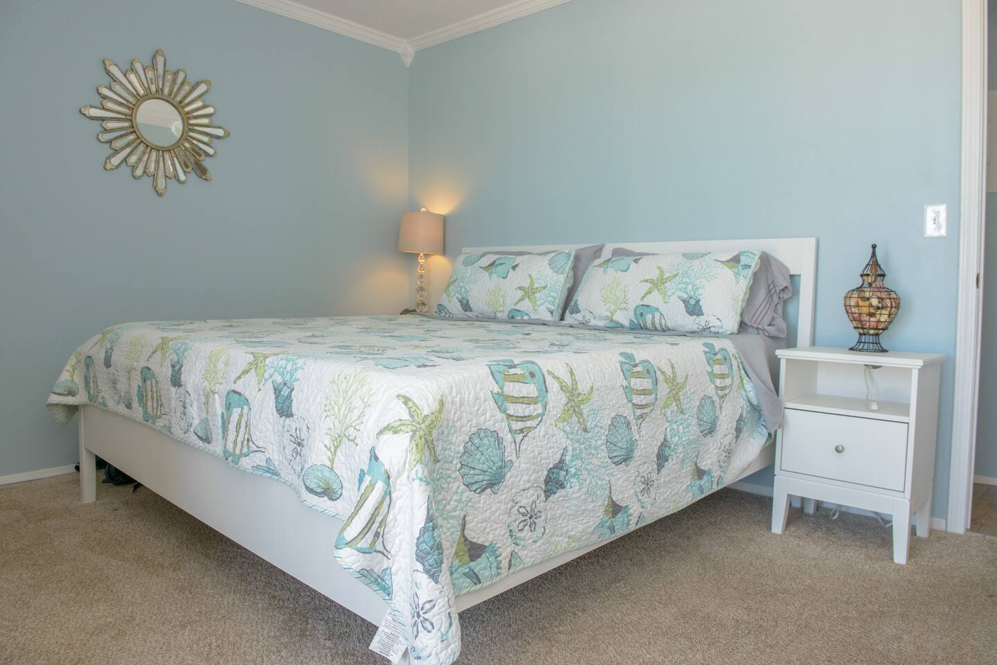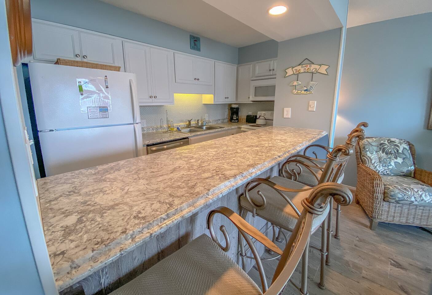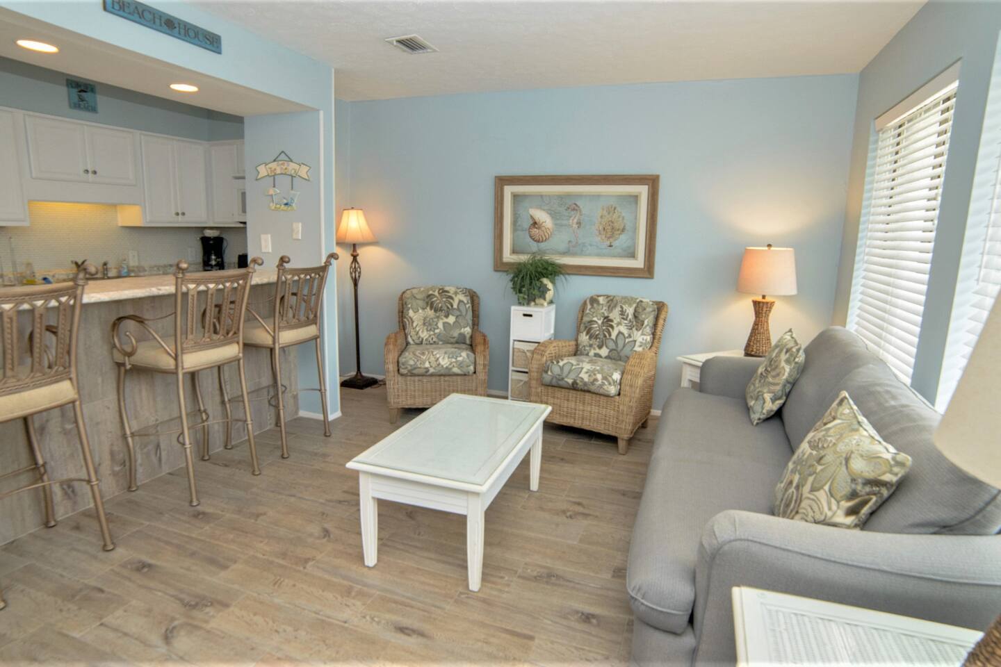 Sunswept Condos feature a Living room with high speed wifi, cable, and an HD TV. The kitchen is fully stocked to prepare meals and serve meals. Includes all major appliances. The is one bathroom. The Bedroom has a King sized bed, dresser, washer/dryer, and a TV with cable.