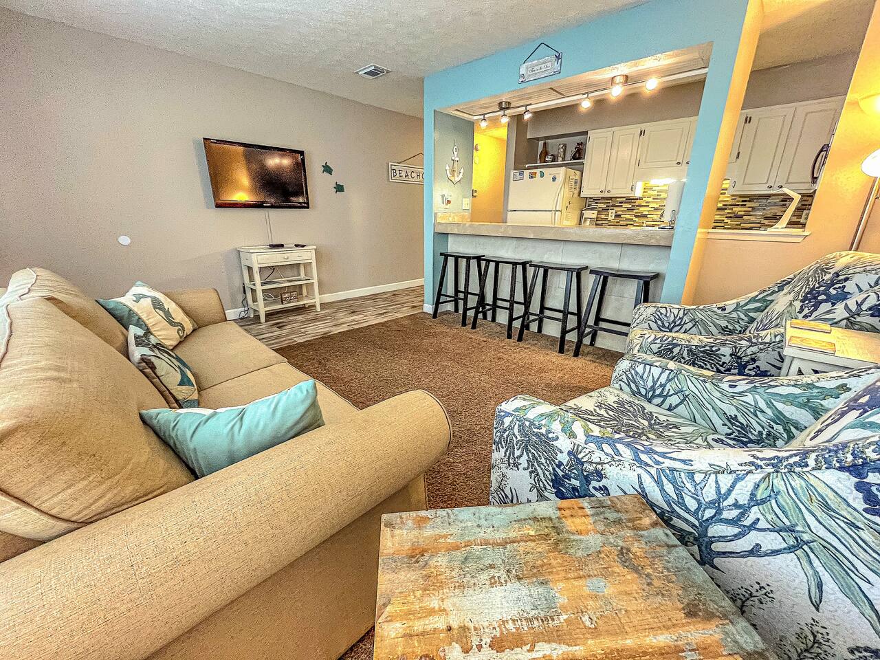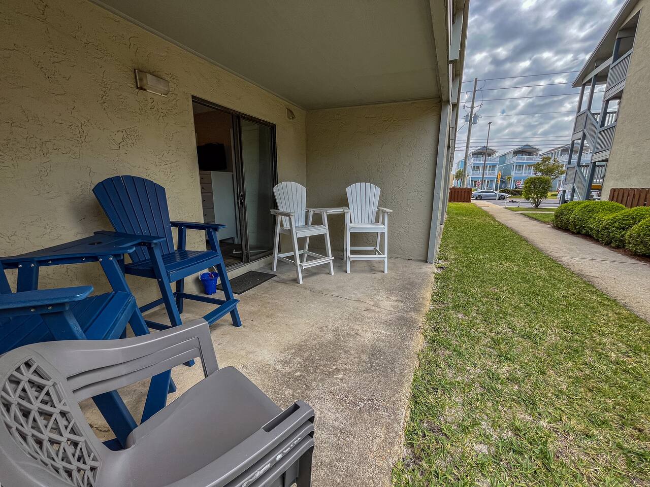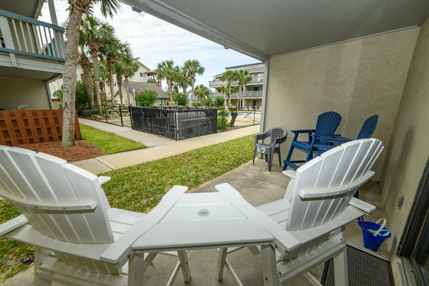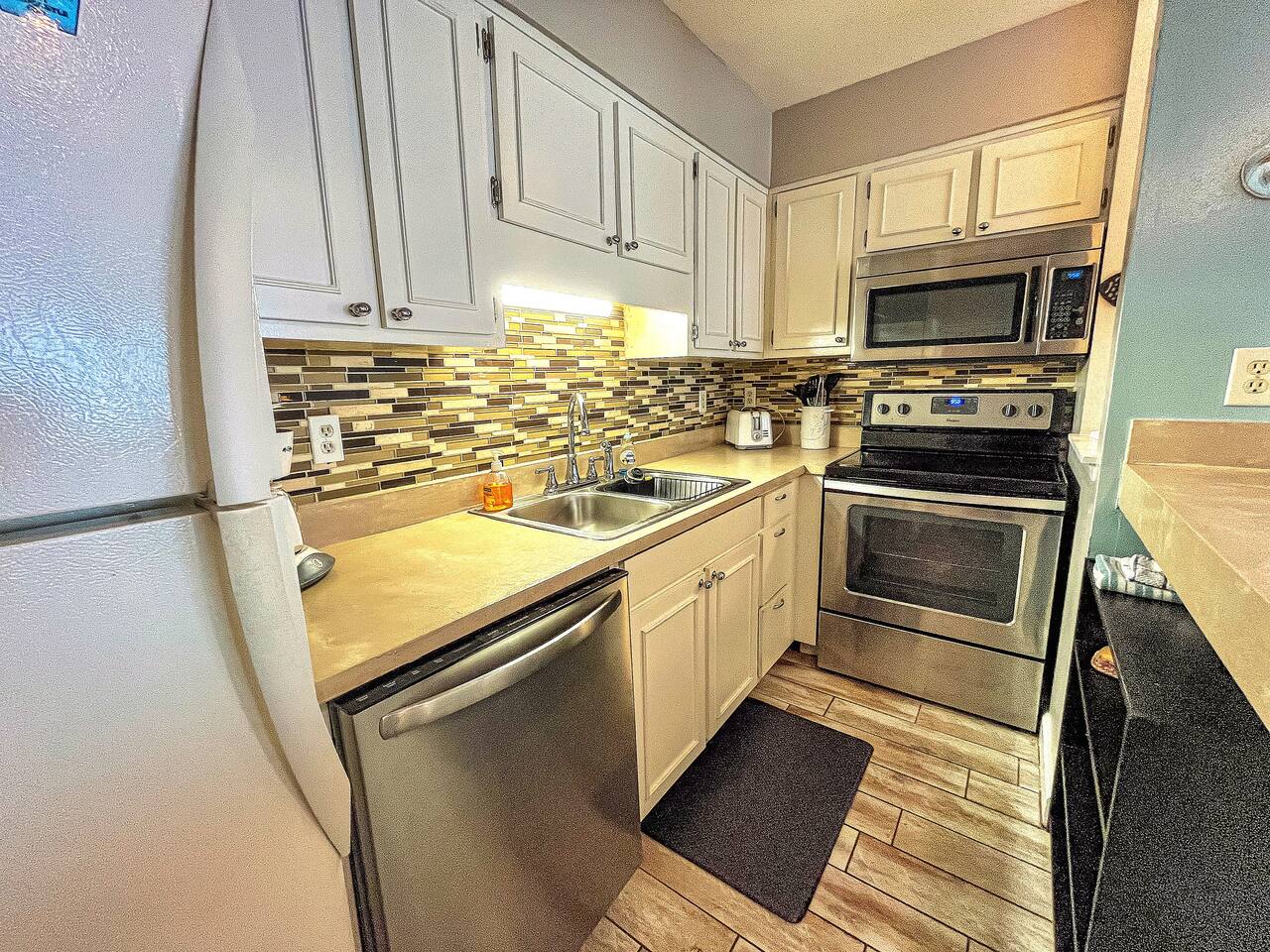 As of July 1st, 2023, this condo has all new bedroom furniture and new chairs in the living room. The entire unit has been freshly painted and new outdoor seating provided. Sunswept Condos feature a Living room with high speed wifi, cable, and an HD TV. The kitchen is fully stocked to prepare meals and serve meals. Includes all major appliances. There is one bathroom. The Bedroom has a King sized bed, dresser, washer/dryer, and a TV with cable. The pool access is outside the back door.