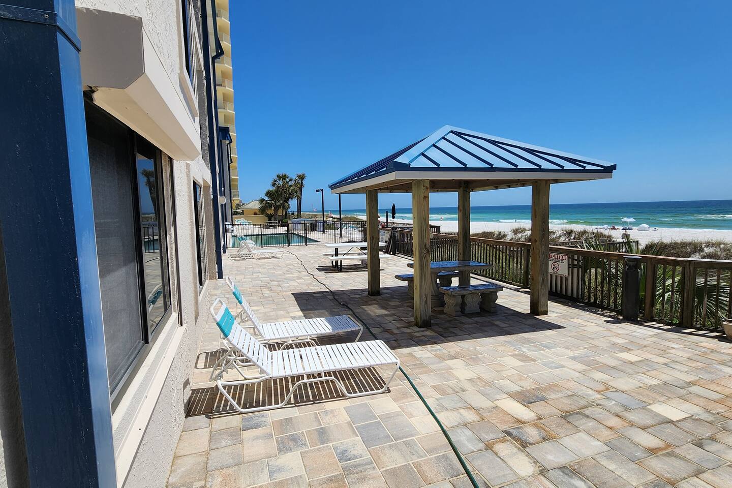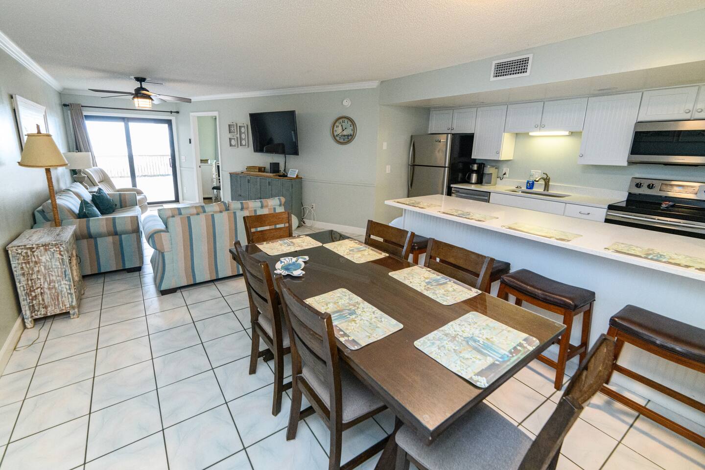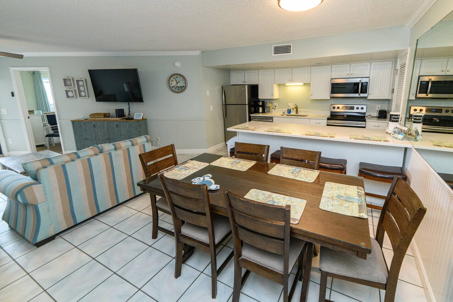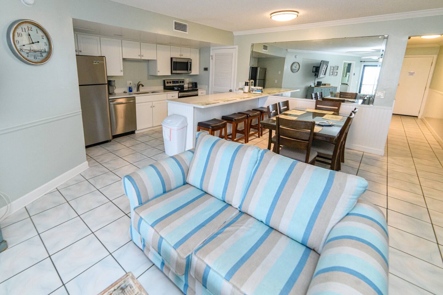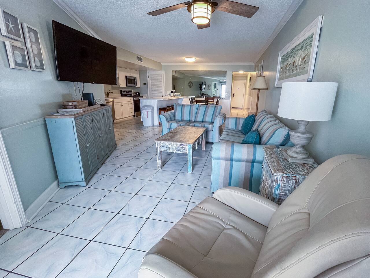 The condo was recently updated with new cabinets, quartz countertops, stainless steel appliances, remodeled bathroom. Living room furniture replaced in 2022. There is an HD TV in the living room and both bedrooms. Being on the ground floor makes access from the parking lot very convenient. The patio, pool, and beach access are all just out the back door. Fantastic views from the Living room and Master Bedroom. We love this location and think you will, too. We also have the unit next door (108). You can book both to accommodate groups up to 16. Click my profile to link to that listing.