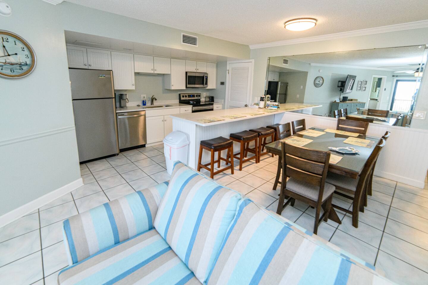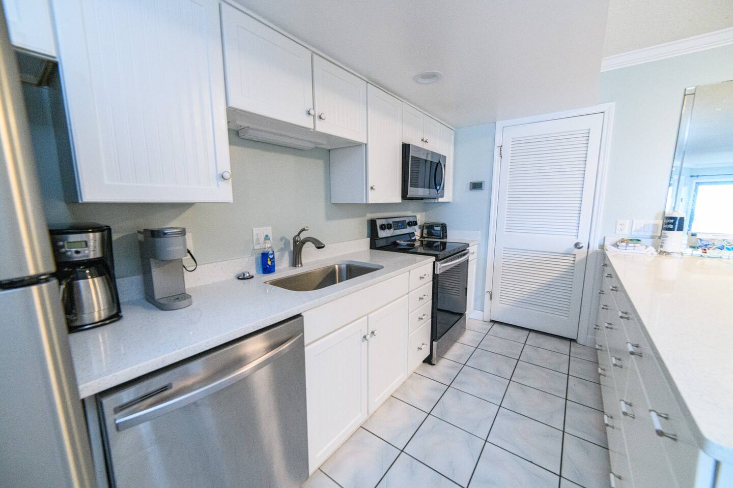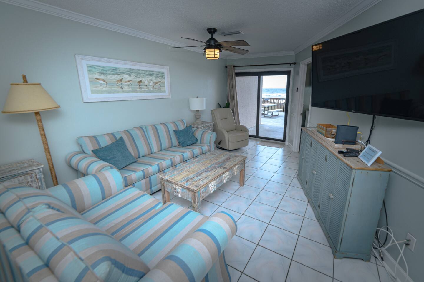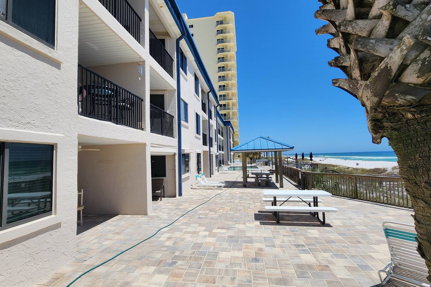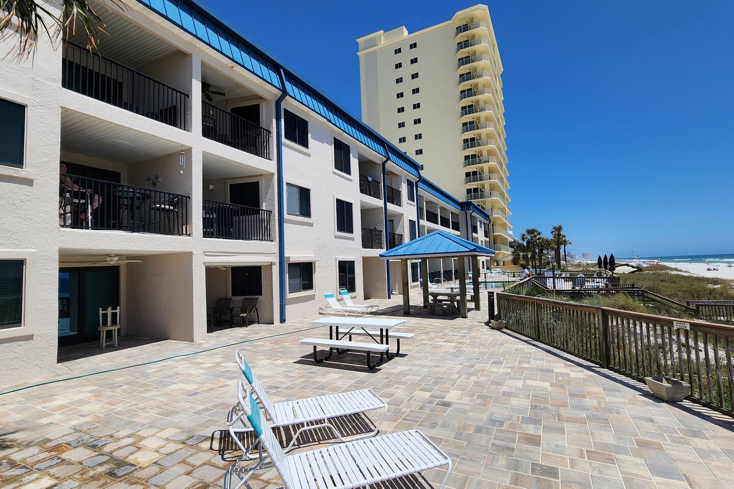 The condo was recently updated with new cabinets, quartz countertops, stainless steel appliances, remodeled bathroom. Living room furniture replaced in 2022. There is an HD TV in the living room and both bedrooms. Being on the ground floor makes access from the parking lot very convenient. The patio, pool, and beach access are all just out the back door. Fantastic views from the Living room and Master Bedroom. We love this location and think you will, too. We also have the unit next door (108). You can book both to accommodate groups up to 16. Click my profile to link to that listing.